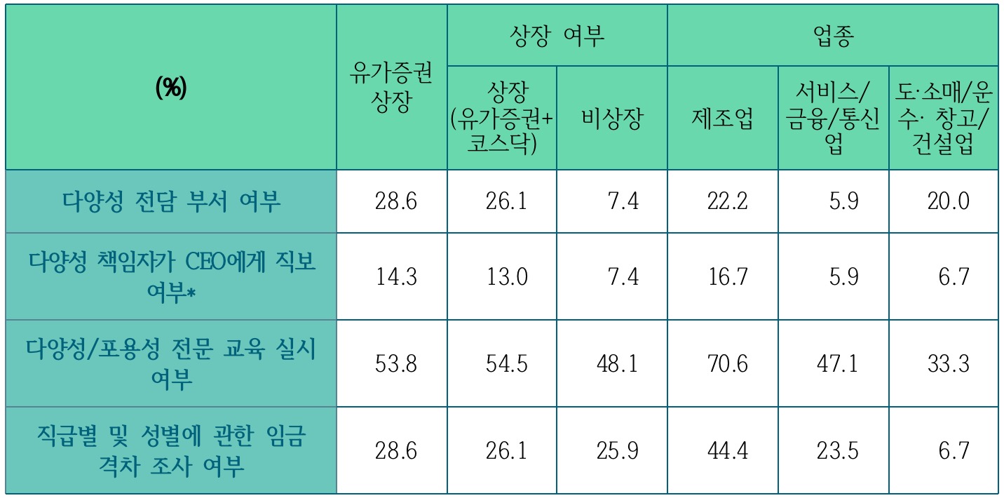 유가 증권상장기업 기준으로 보면, 다양성 전담 부서가 있는 경우는 30% 미만이며, 그 절반 정도만이 회사 대표에게 다양성 관련 사항을 직접 보고하고 있다. 다양성/포용성 전문 교육은 54%가 실시한다고 응답했으며, 직급별/성별 임금 격차를 조사하는 경우는 30% 미만인 것으로 나타났다. 비상장기업의 경우, 다양성 전담 부서를 설치 운영하는 비율이 상장기업에 비해 낮아, 다양성 전략 경영 돌입이 더 미진한 것으로 나타났다. 업종별로 보면, 제조업에서 다양성 관련 경영과 조직문화에 더 노력을 기울이고 있는 것으로 나타났다. 상대적으로, 서비스/금융업 등에서는 다양성 전담 부서 설치 비율이 낮고, 도소매/운수/건설업 등에서는 직급별, 성별 임금 격차를 조사하는 비율이 낮아 형평적 제도 정립을 위한 토대가 미흡하다고 보인다.