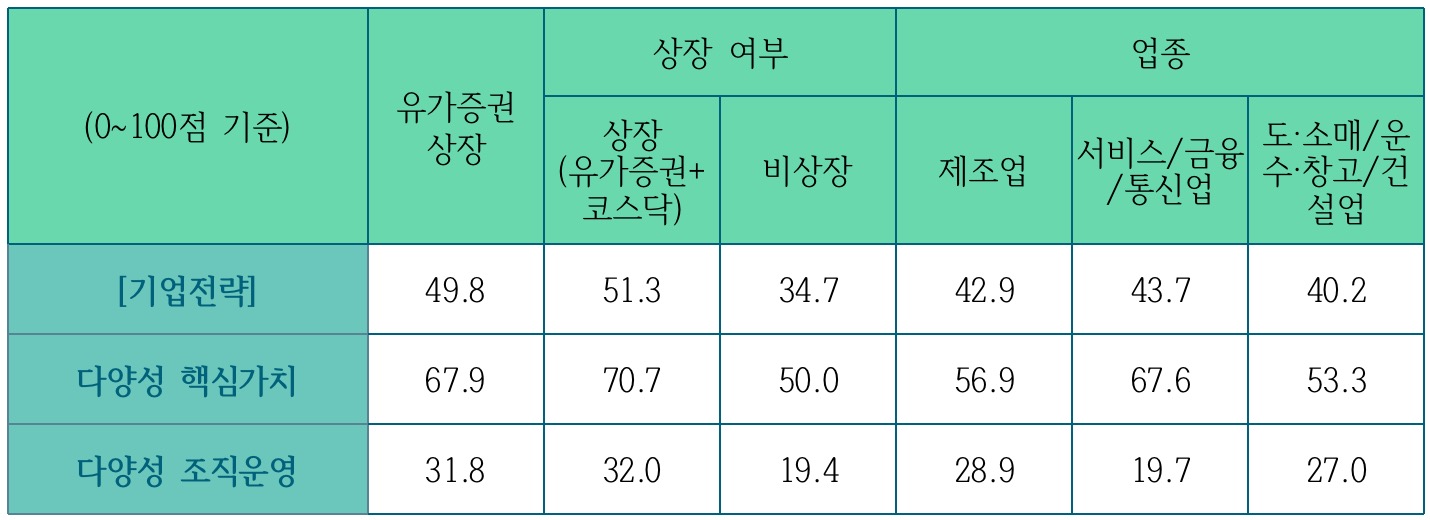 (n=27)으로는 43.0으로, 비상장기업 대비 상장기업이 전반적인 다양성 환경이 우수하다고 할 수 있다. 업종별로 보면 제조업이 50.0으로 다른 업종 대비 높은 편으로 나타났다. 그러나 본 조사는 업종을 구분하지 않고 항목을 측정하였으며, 측정 결과가 각 업종의 특성을 반영하지 않고 있다. 따라서 특정 업종 점수가 높다고 하더라도 그 업종이 다른 업종보다 절대적으로 다양성 수준이 높다고 평가할 수 없다.